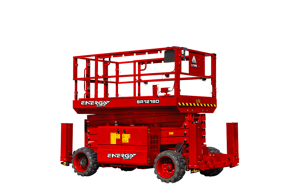 ENERGYLIFT SR1218D, özellikle şantiye çalışmaları, dış cephe montaj uygulamaları, bakım işleri ve endüstriyel projeler için ideal bir dizel engebeli arazi makaslı platform çözümüdür.